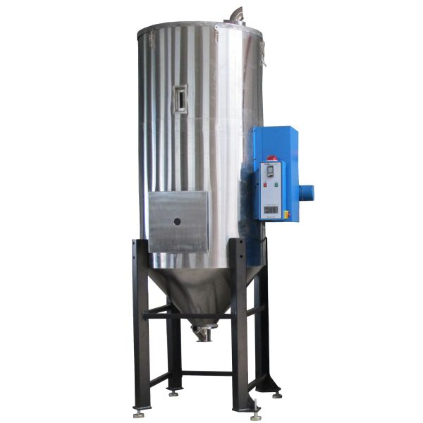 PET crystallizers are used for constant crystallization of un-crystallized PET regrinds or pellets. Processed materials can then be dried and dehumidified directly which can decrease cost. This system mainly consists of heating elements, insulated hopper and agitator screw mixing device. After un-crystallized PET materials are fed into the hopper, the system starts crystallization and agitator starts blending to prevent formation in lumps. Crystallized materials can be conveyed to material storage bin or into drying hopper directly.